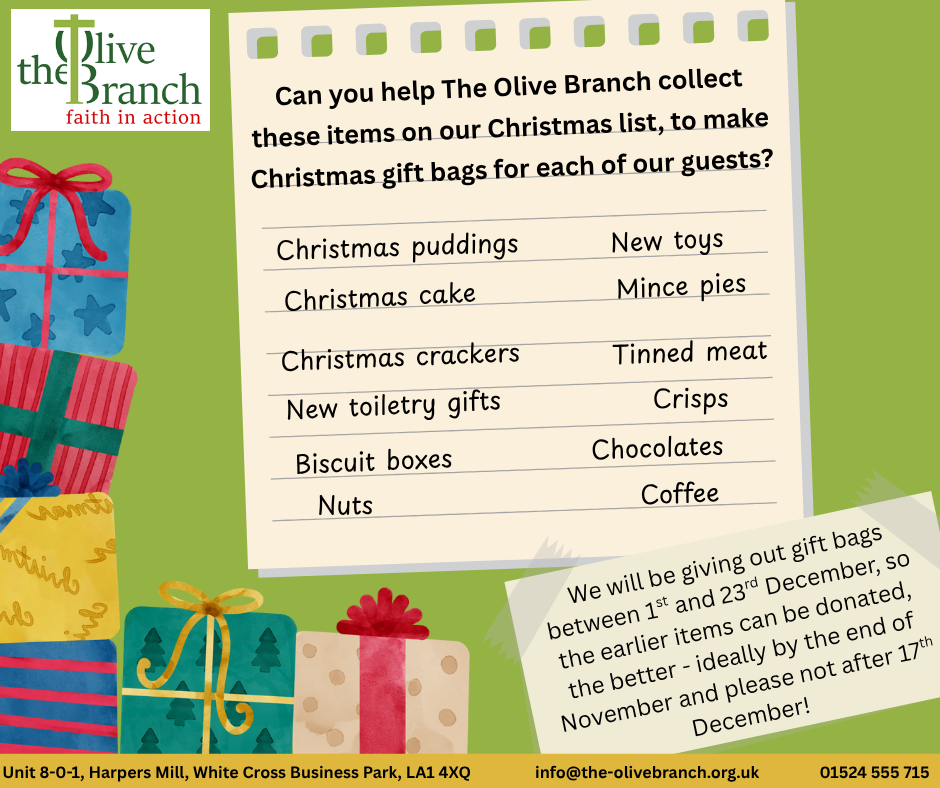 As well as Christmas Donations, The Olive Branch still requires regular donations of the following :