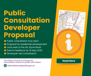 A developer has launched a public consultation on a residential development west of the A6, Slyne Road, Bolton-le-Sands. Residents are invited to view the proposals and submit feedback. Consultation opens 28th April 2025. (Courtesy of Bolton-le-Sands Parish Council)